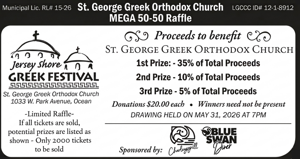 Join us in 2026 as we celebrate our 12th annual Jersey Shore Greek Festival on May 29, 30, and 31, located on the grounds of the St. George Greek Orthodox Church, 1033 West Park Avenue, Ocean, N.J.